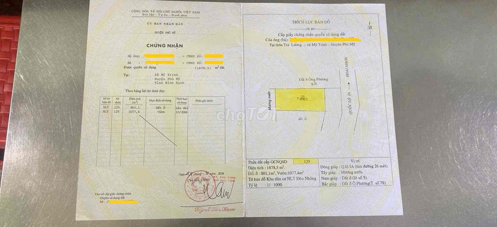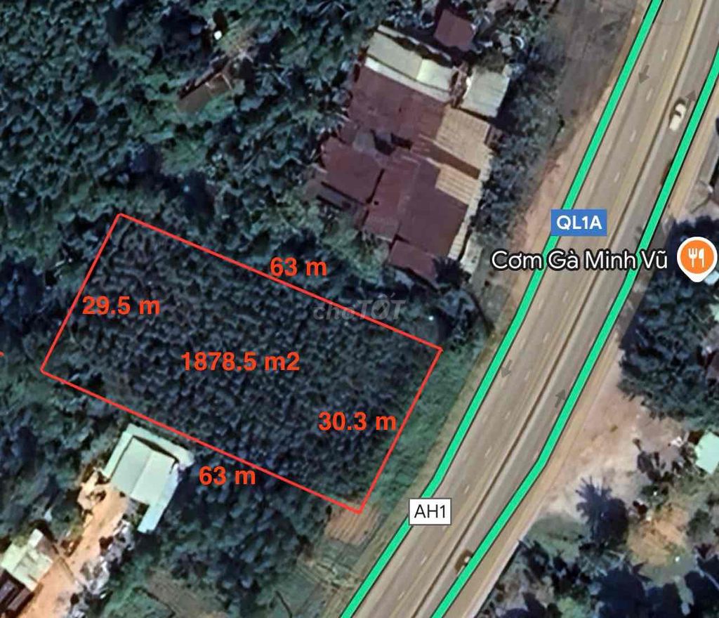 - Đất sổ hồng với diện tích tổng 1878,5 m2 , trong đó có 801,1 m2 đất ở và 1077,4 m2 đất vườn. Mặt tiền rộng 30,3m, chiều dài 63m.
