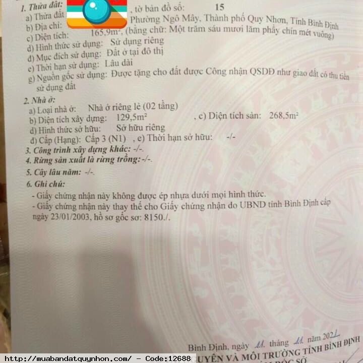 Quý vị đang xem nội dung tin rao ''Bán hoặc cho thuê dài hạn căn nhà thuộc Phường Ngô Mây_Trung tâm TP Quy Nhơn - DIện tích: 165,9m2 ngang 6m62 nở hậu 6m74, Dtsd: 268,5m2 - Kết cấu: nhà 2 tầng, đầy đủ công năng, '' quý vị cần thêm thông tin hãy liên hệ với chúng tôi. Xin cảm ơn đã xem tin.